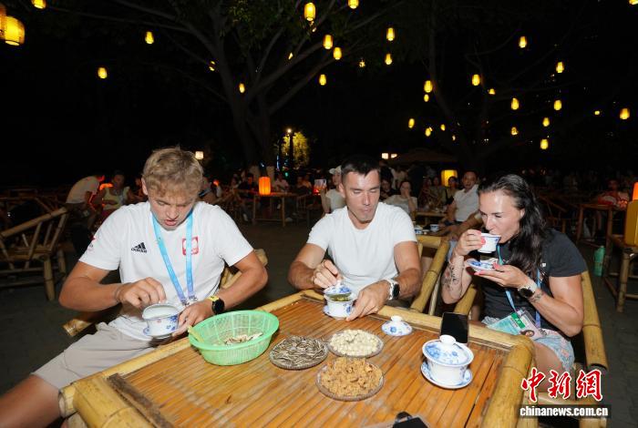 8月6日晚,成都世運會外籍運動員等在成都望江樓公園品成都蓋碗茶?!≈行律缬浾?安源 攝