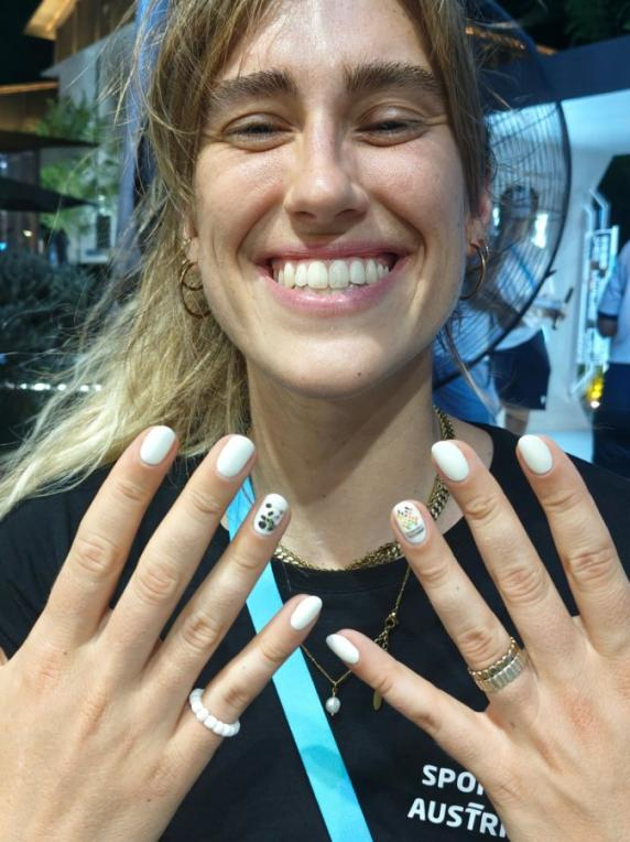 澳大利亞姑娘向記者展示美甲機(jī)器人噴繪的熊貓圖案