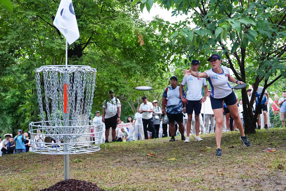 擲準(zhǔn)飛盤比賽在高新區(qū)桂溪生態(tài)公園舉行,觀眾既可登上主看臺(tái)近距離觀賽,也能在公園周邊空地的指定區(qū)域自由觀賽。奧地利選手納拉特很享受比賽過(guò)程,“我喜歡這個(gè)場(chǎng)地,有草地、有樹木、有湖泊,滿眼都是綠色”。