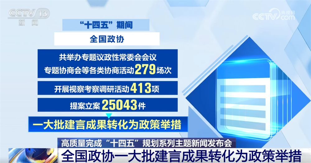 “十四五”期間,全國政協(xié)共舉辦專題議政性常委會會議、專題協(xié)商會等各類協(xié)商活動279場次,開展視察考察調研活動413項,提案立案25043件,一大批建言成果轉化為政策舉措。