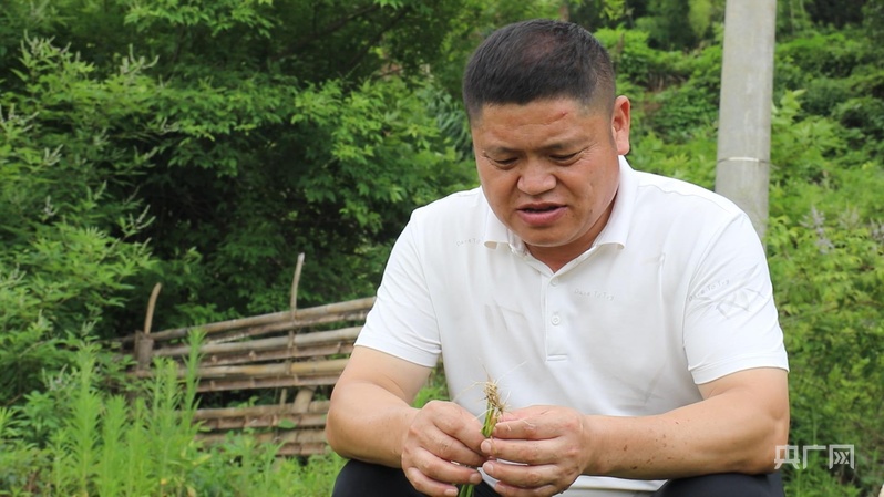 鄭春模仔細(xì)觀察梯田秧苗生長(zhǎng)情況(央廣網(wǎng)記者 王一凡 攝)