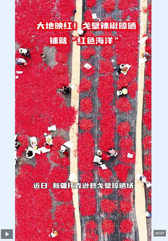 近日,新疆托克遜縣戈壁晾曬場“變身”辣椒晾曬場,鋪成了一片壯觀的“紅色海洋”。
