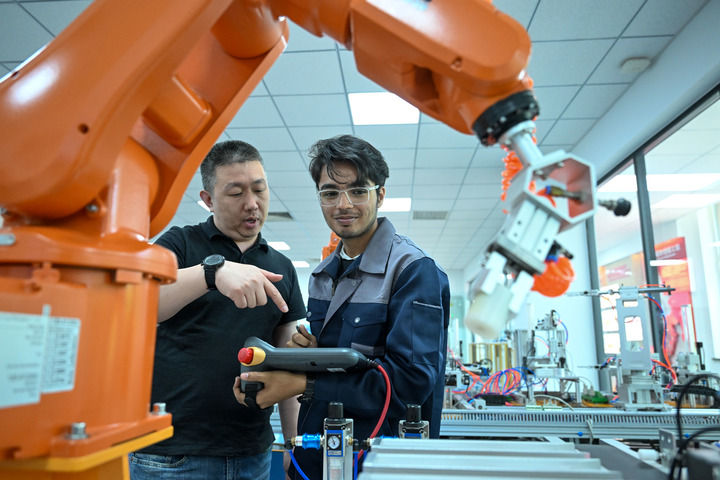 在天津現代職業(yè)技術學院魯班工坊實訓教室,教師指導學生操作設備(2025年6月16日攝)。