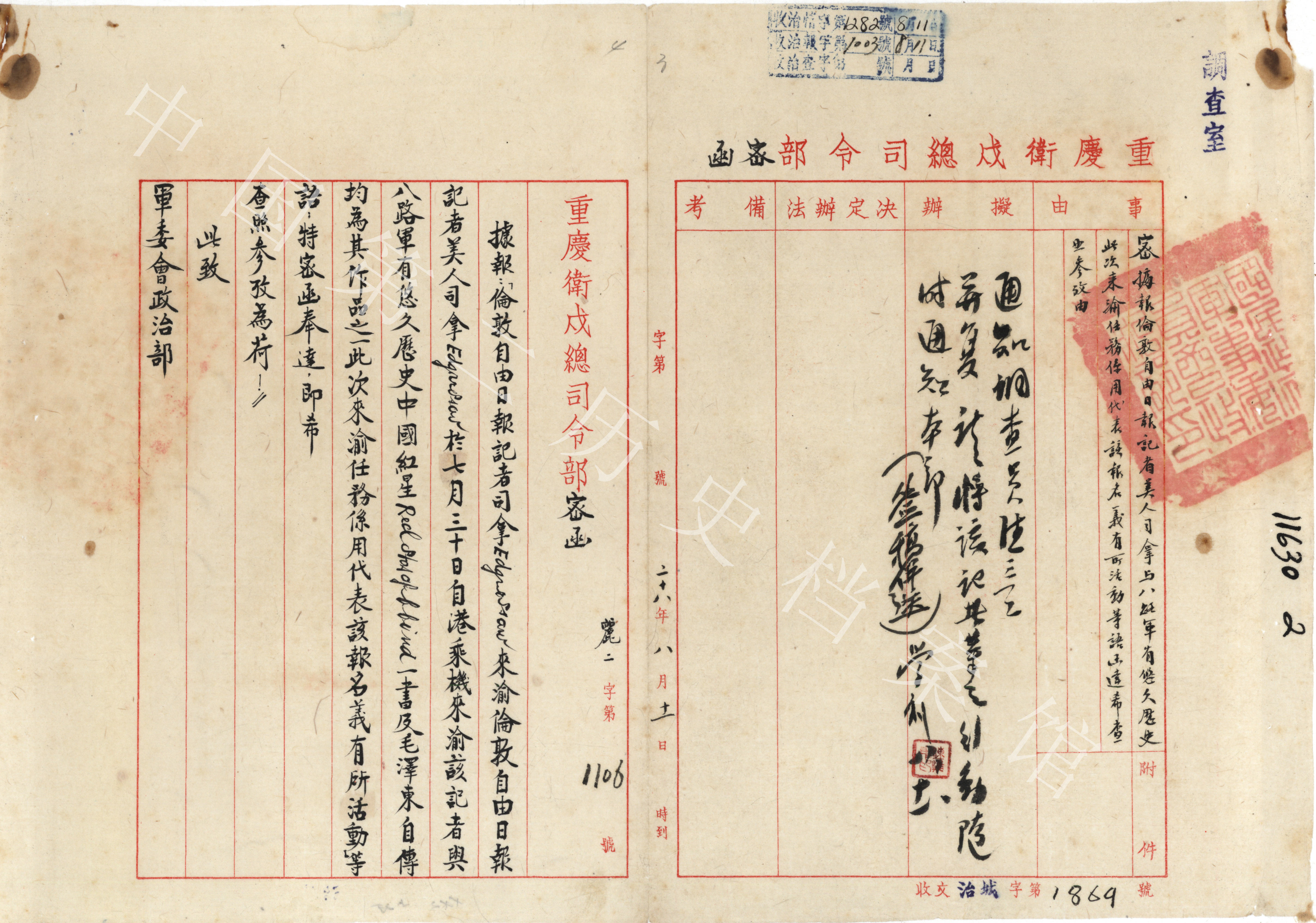 1939年8月重慶衛(wèi)戍總部向國(guó)民政府軍事委員會(huì)政治部報(bào)告斯諾在重慶活動(dòng)情形的密函(中國(guó)第二歷史檔案館藏)