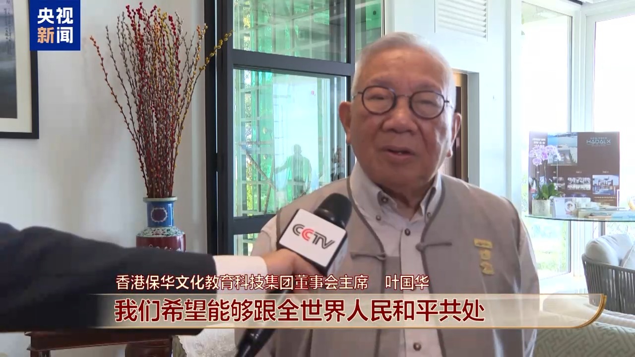 香港保華文化教育科技集團董事會主席 葉國華:我一般看電視都坐著。今天我不是坐著而是站著。因為我用最尊敬的心來看。習近平主席講話精神是,我們希望能夠跟全世界人民和平共處,能夠以構(gòu)建人類命運共同體來帶動全球。