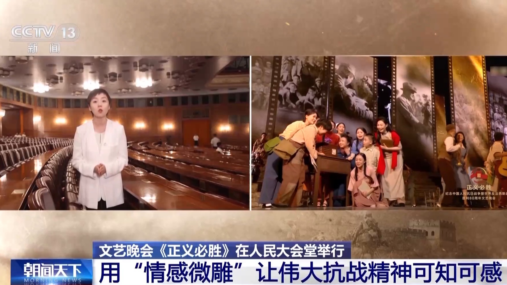 3日晚,紀(jì)念中國人民抗日戰(zhàn)爭暨世界反法西斯戰(zhàn)爭勝利80周年文藝晚會《正義必勝》在人民大會堂舉行。
