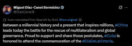 迪亞斯-卡內(nèi)爾在社交媒體上發(fā)文稱,“在綿延千年的歷史與激勵億萬人的當下之間,中國今日引領(lǐng)捍衛(wèi)多邊主義與全球治理的斗爭。古巴為支持并踐行這些理念而自豪,并榮幸出席勝利日紀念活動。”