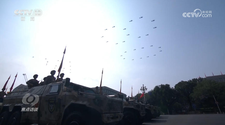 藍(lán)天之上,轟鳴聲持久不息,由26架直-19型武裝直升機(jī)組成的“80”字樣編隊(duì)向天安門飛來,寓意紀(jì)念中國人民抗日戰(zhàn)爭暨世界反法西斯戰(zhàn)爭勝利80周年。