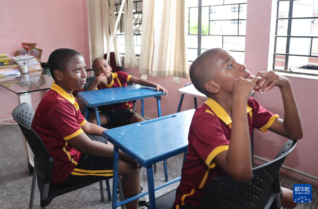 9月4日,在牙買加首都金斯敦艾特特殊教育小學,學生學習中文。新華社記者 李夢馨 攝
