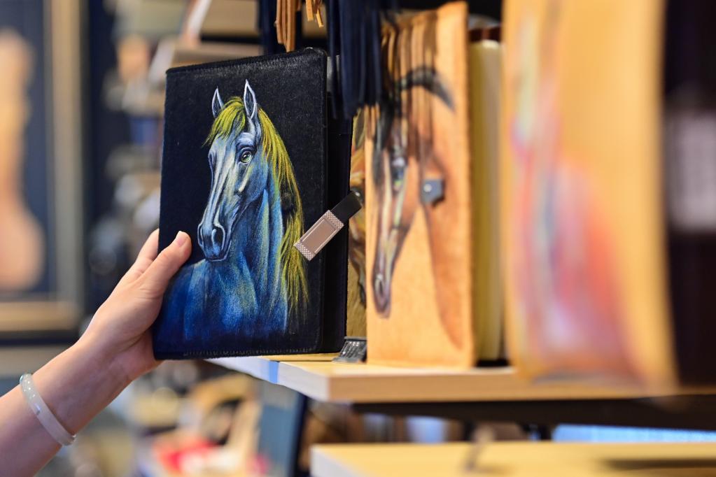 “伊犁是‘天馬之鄉(xiāng)’,我們?cè)谄っ惑w的馬皮上進(jìn)行手工繪畫(huà),每幅圖案都是獨(dú)一無(wú)二的,讓非遺與旅游深度融合?!钡觊L(zhǎng)茹柯耶·艾散介紹,店鋪還開(kāi)發(fā)出馬毛筆記本、首飾等文創(chuàng)衍生品,深受年輕人喜愛(ài)。
