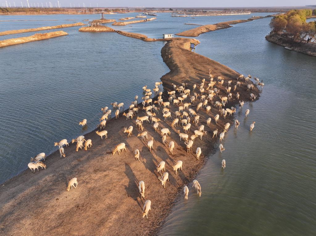 2024年12月21日在大豐野鹿蕩拍攝的麋鹿(無人機(jī)照片)。新華社記者 季春鵬 攝