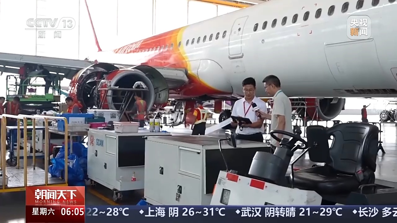 一站式飛機維修產(chǎn)業(yè)基地副總監(jiān) 楊文博:我們現(xiàn)在看到的這架是來自泰國的,這里兩架越南的,機坪上也有等待進機庫進行維修的一架境外飛機。我們今年上半年的境外維修飛機的數(shù)量已經(jīng)接近于去年一年的量了。現(xiàn)在每條線位都已經(jīng)是滿的了,一直要持續(xù)到2026年11月底。