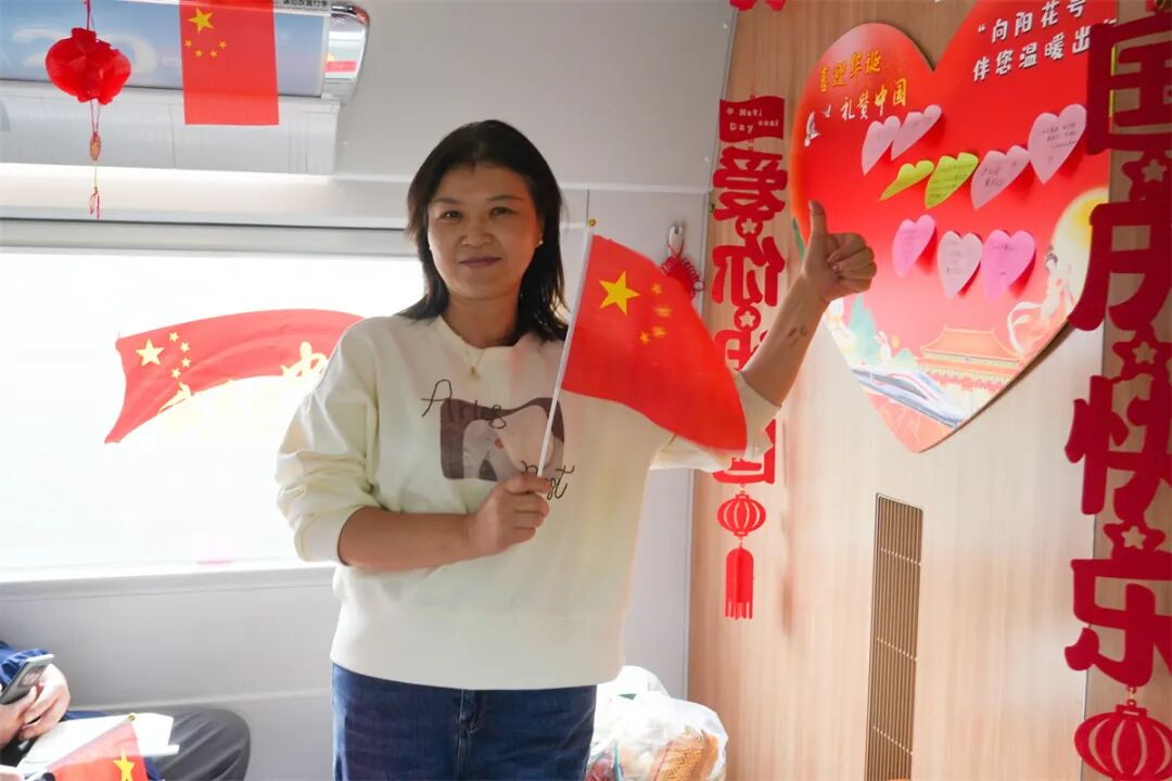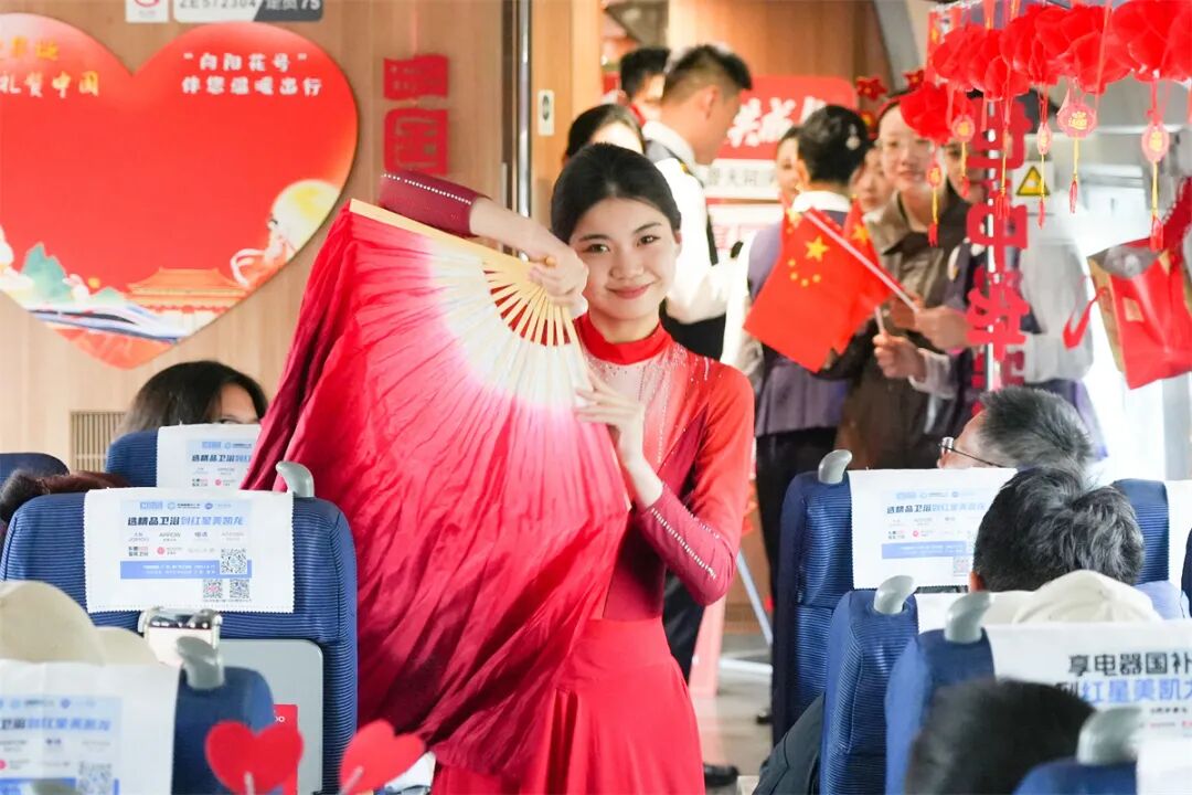 車廂內(nèi)掛滿條幅、彩帶和中國(guó)結(jié),洋溢著節(jié)日的喜慶氛圍。在舞蹈《親愛的你啊》的優(yōu)美旋律中,列車聯(lián)歡拉開序幕。