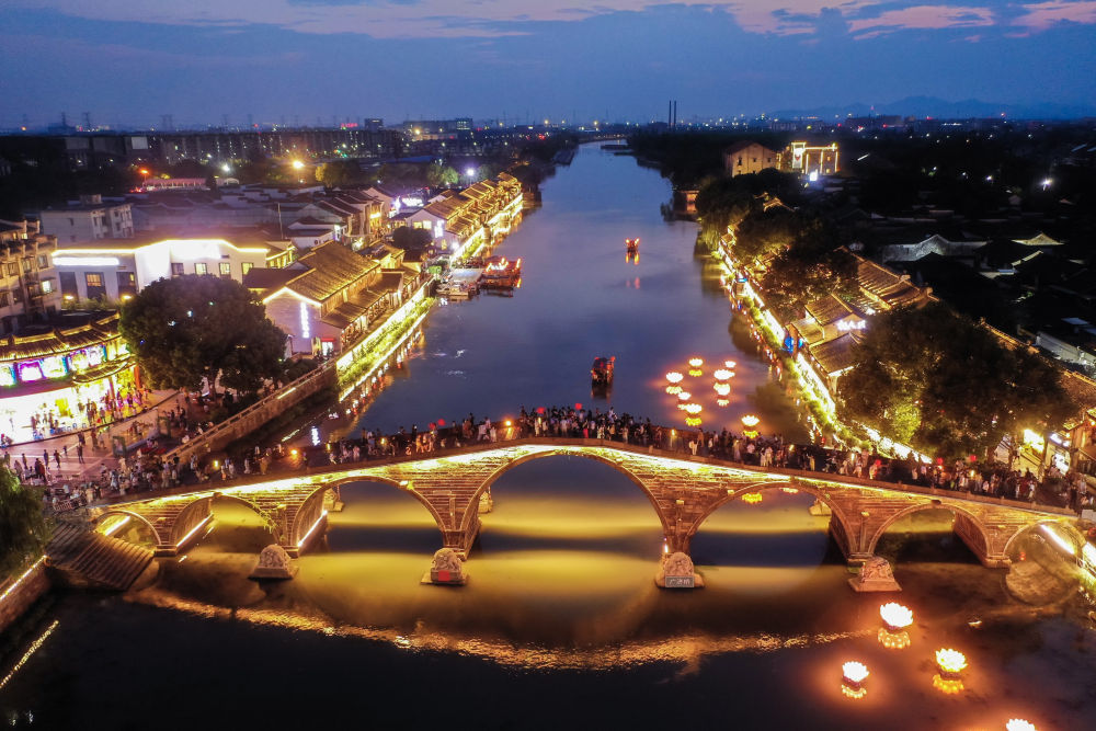 10月2日,游客在塘棲古鎮(zhèn)的廣濟橋觀賞運河夜景(無人機照片)。 新華社記者 徐昱 攝