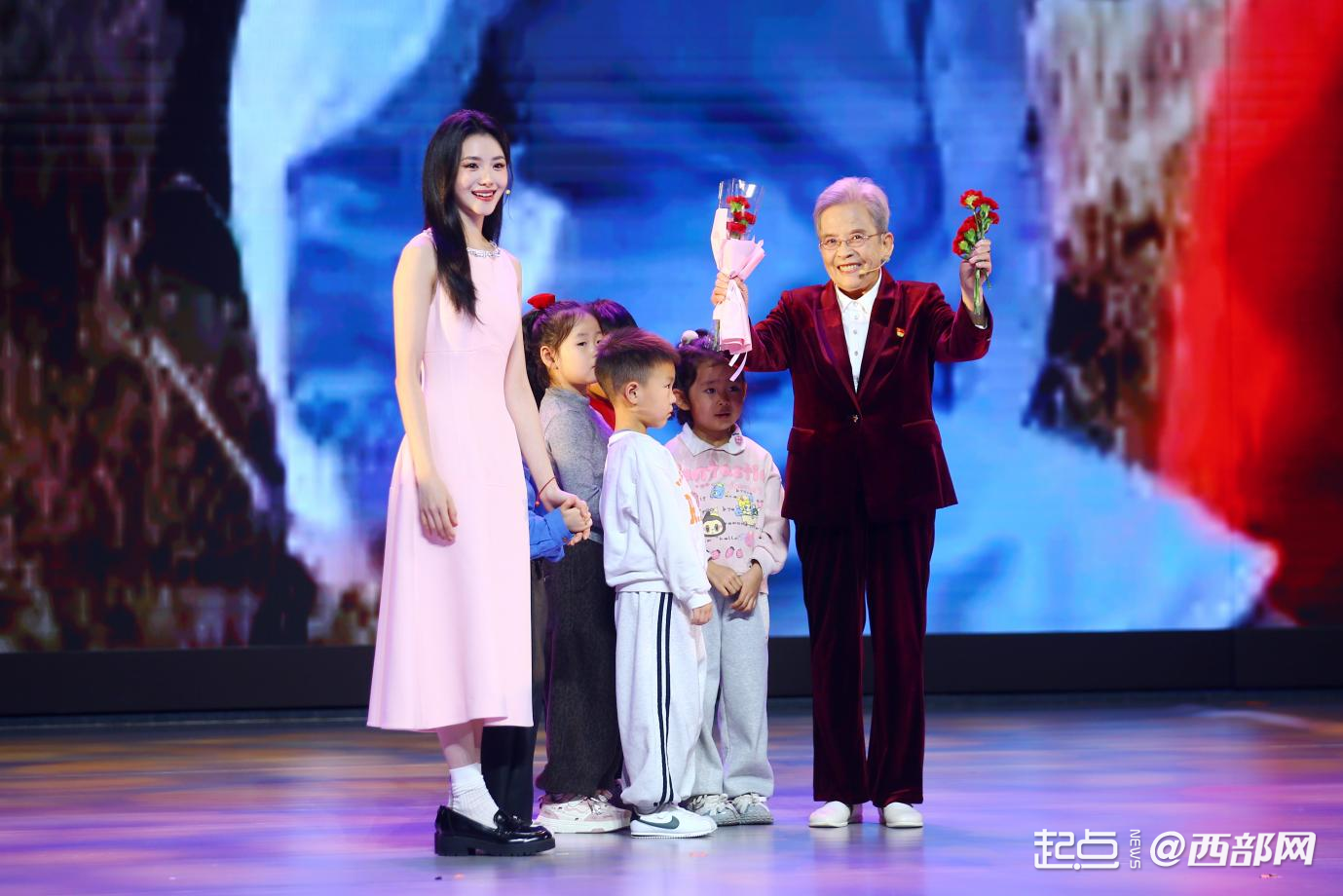 啟動儀式現(xiàn)場,演員劉浩存牽著小朋友們?yōu)槁飞匪蜕硝r花。