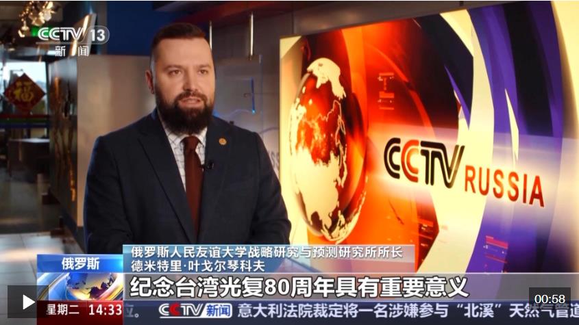俄羅斯人民友誼大學(xué)戰(zhàn)略研究與預(yù)測研究所所長 德米特里·葉戈爾琴科夫:紀念臺灣光復(fù)80周年具有重要意義,象征著中國人民心向統(tǒng)一。戰(zhàn)勝日本軍國主義是世界反法西斯戰(zhàn)爭的重要組成部分,這一歷史應(yīng)該被銘記。