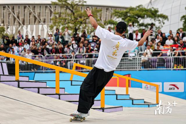 11月11日下午,十五運(yùn)會滑板項目男子街式?jīng)Q賽,廣東隊潘家杰完成高難度動作后展開雙臂與歡呼的觀眾們互動。鄭新洽 攝