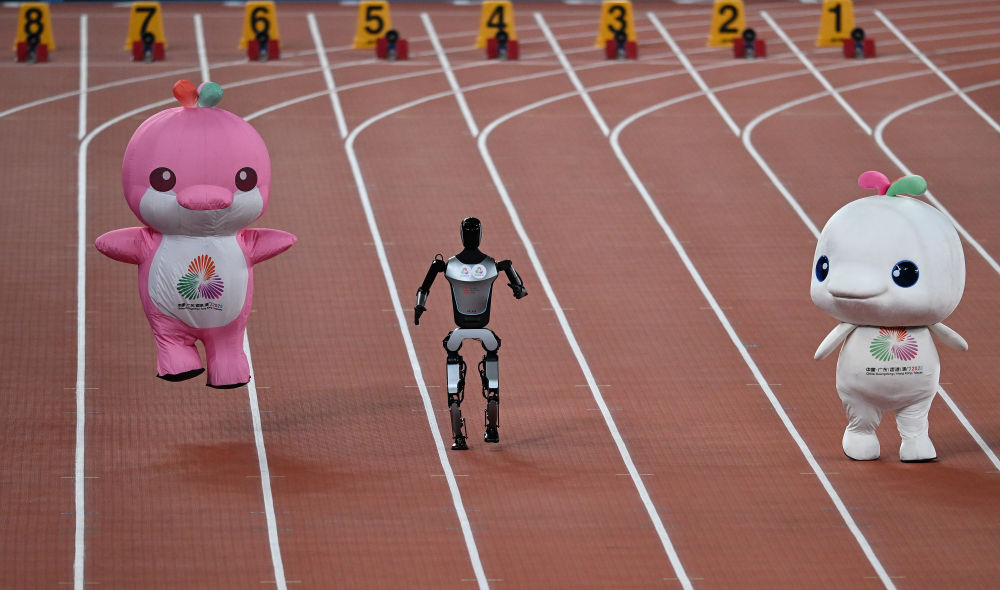 11月17日,在田徑項(xiàng)目賽事開始前的暖場(chǎng)活動(dòng)中,機(jī)器人和吉祥物喜洋洋、樂融融在廣東奧體中心體育場(chǎng)賽跑。新華社記者 周牧 攝