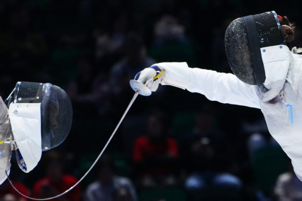 11月20日,江蘇隊(duì)選手霍興欣(左)和廣東隊(duì)選手吳培林在女子花劍團(tuán)體銅牌賽中。
