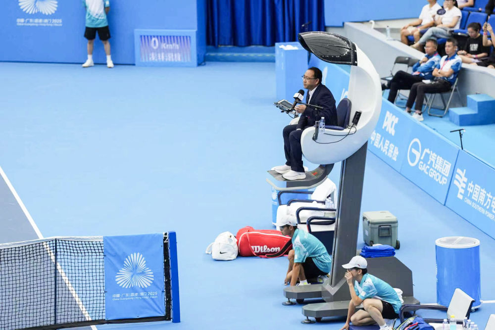 這是11月15日在廣東珠海橫琴網(wǎng)球中心拍攝的智能電動(dòng)升降裁判椅。