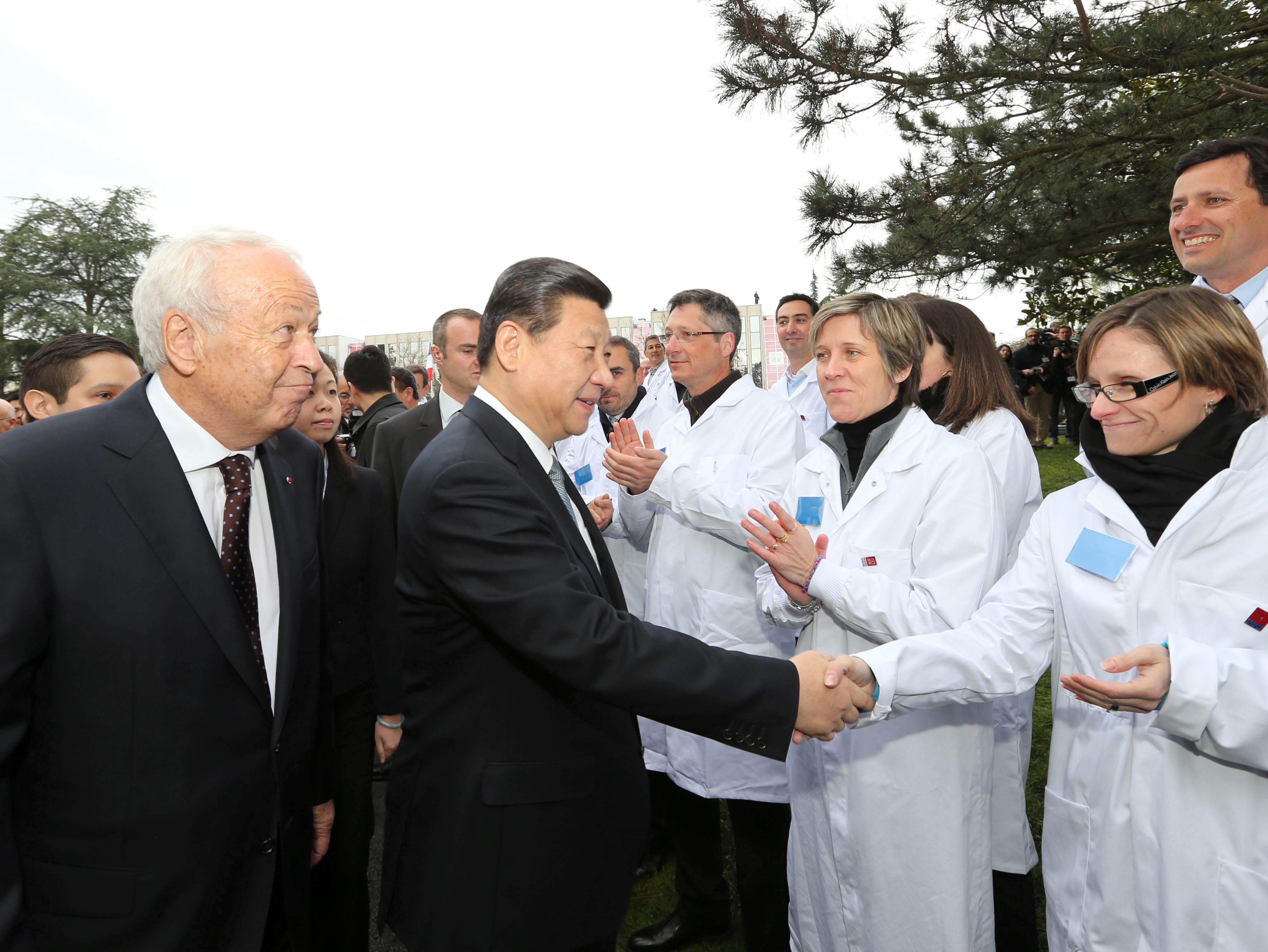 2014年3月26日,習(xí)近平主席在法國(guó)里昂參觀梅里埃生物科研中心,與科研中心員工握手。