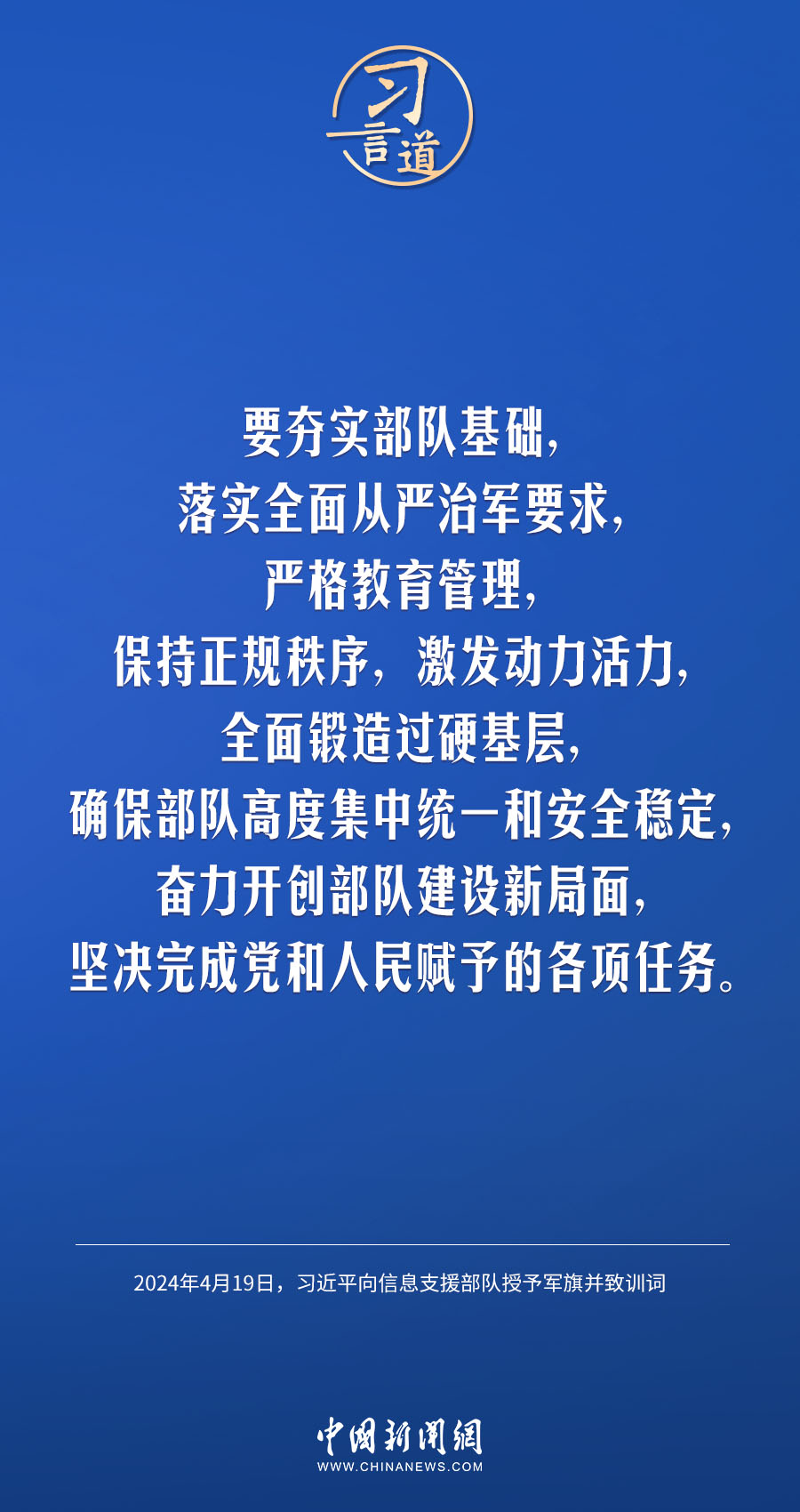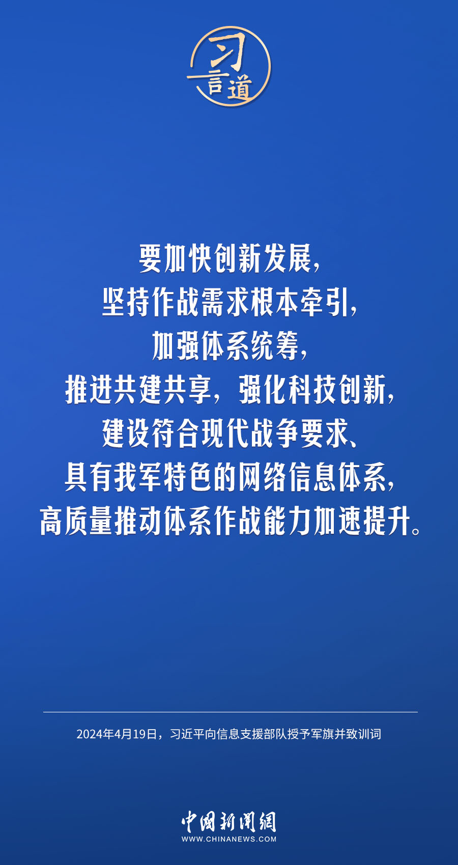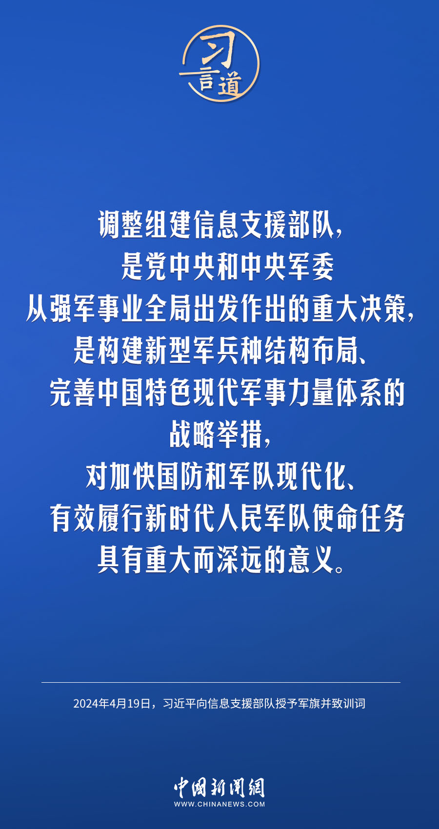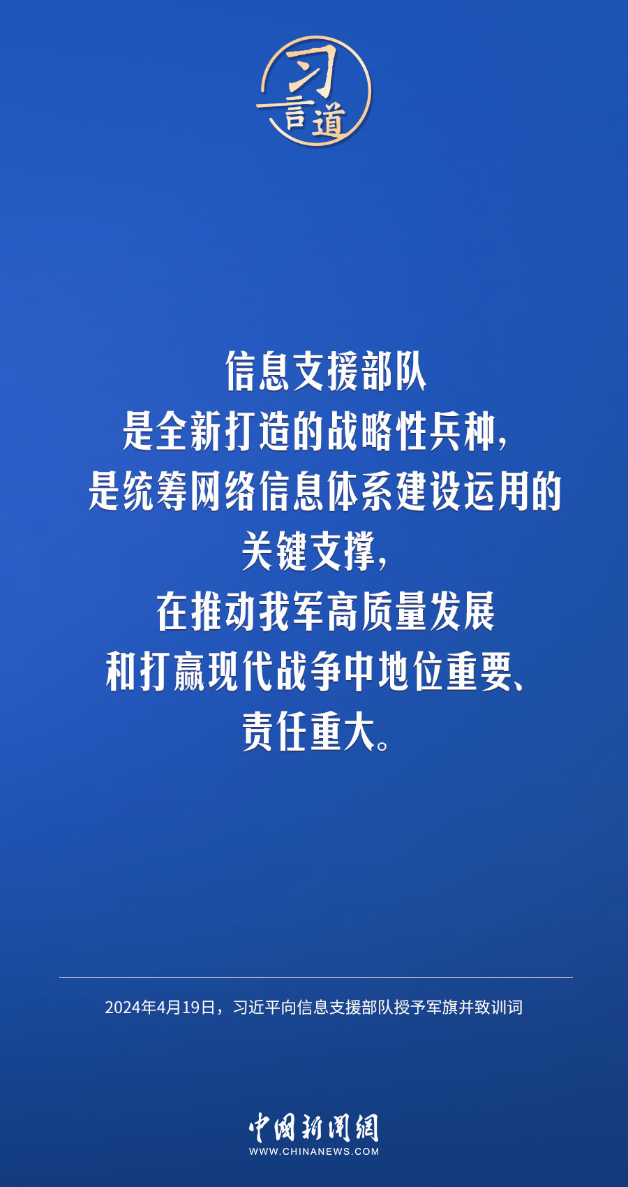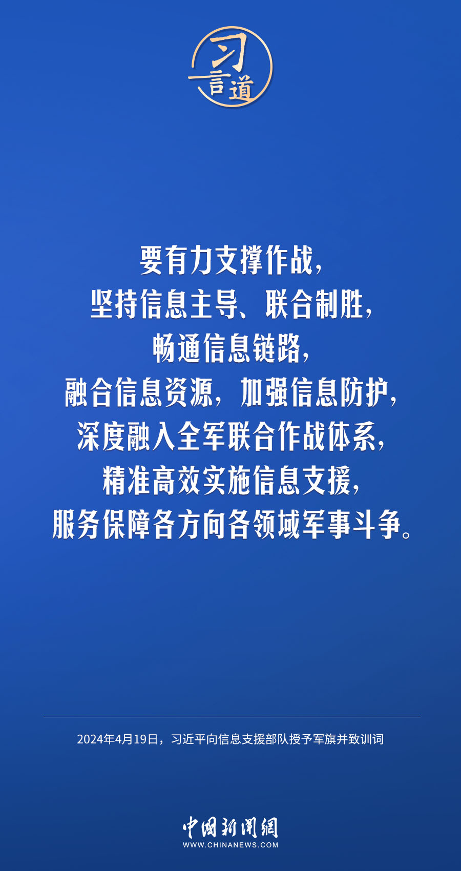 中國(guó)人民解放軍信息支援部隊(duì)成立大會(huì)19日在北京八一大樓隆重舉行。中共中央總書(shū)記、國(guó)家主席、中央軍委主席習(xí)近平向信息支援部隊(duì)授予軍旗并致訓(xùn)詞,代表黨中央和中央軍委向信息支援部隊(duì)全體官兵致以熱烈祝賀。他強(qiáng)調(diào)——