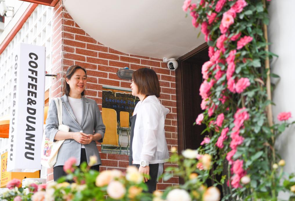 4月23日,伍成莉與社區(qū)內(nèi)店鋪工作人員交談。