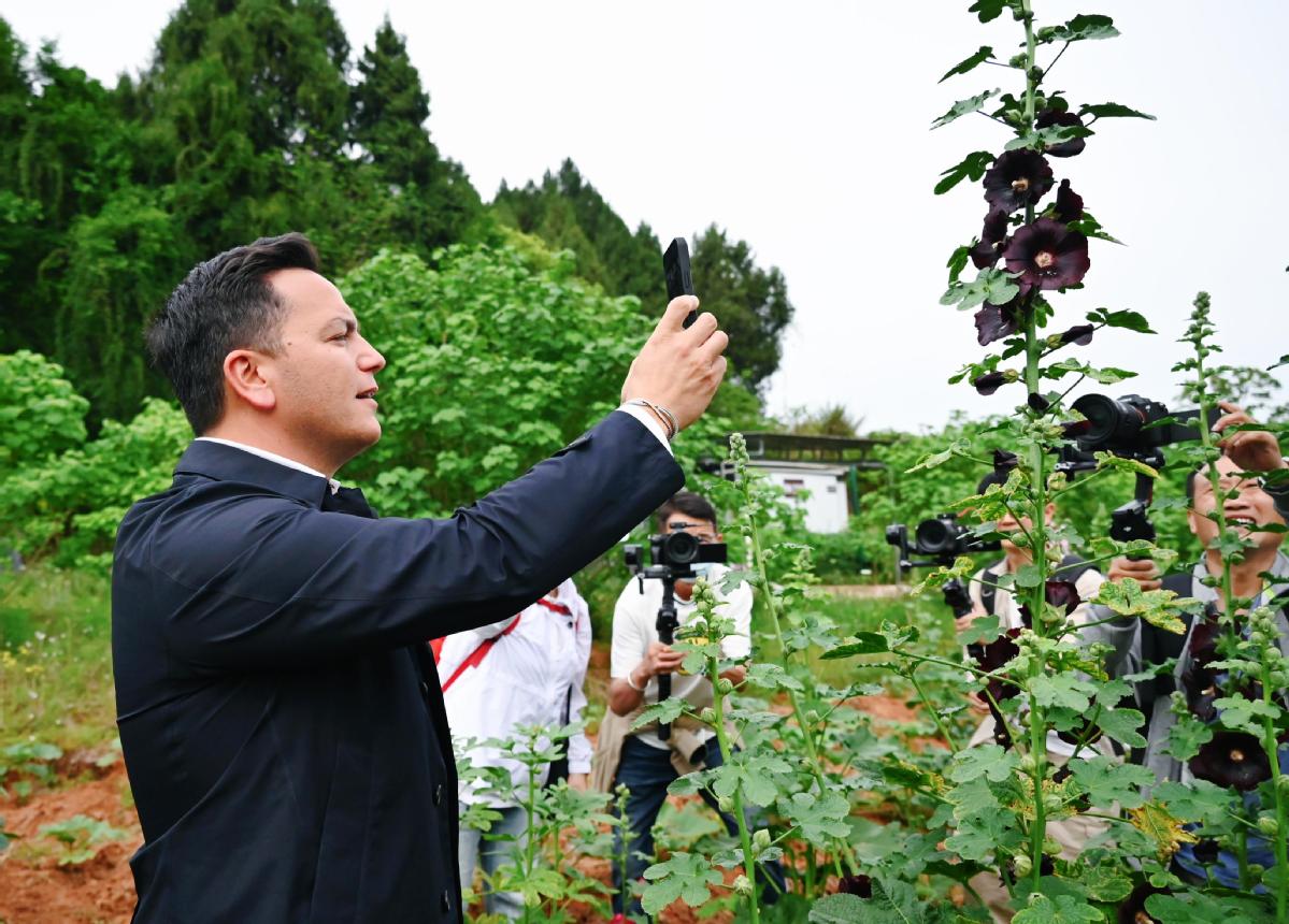 2024年4月23日,國際園藝生產者協(xié)會主席萊昂納多·卡皮塔尼奧在成都市金堂縣鮮花山谷景區(qū)考察蜀葵產業(yè)。