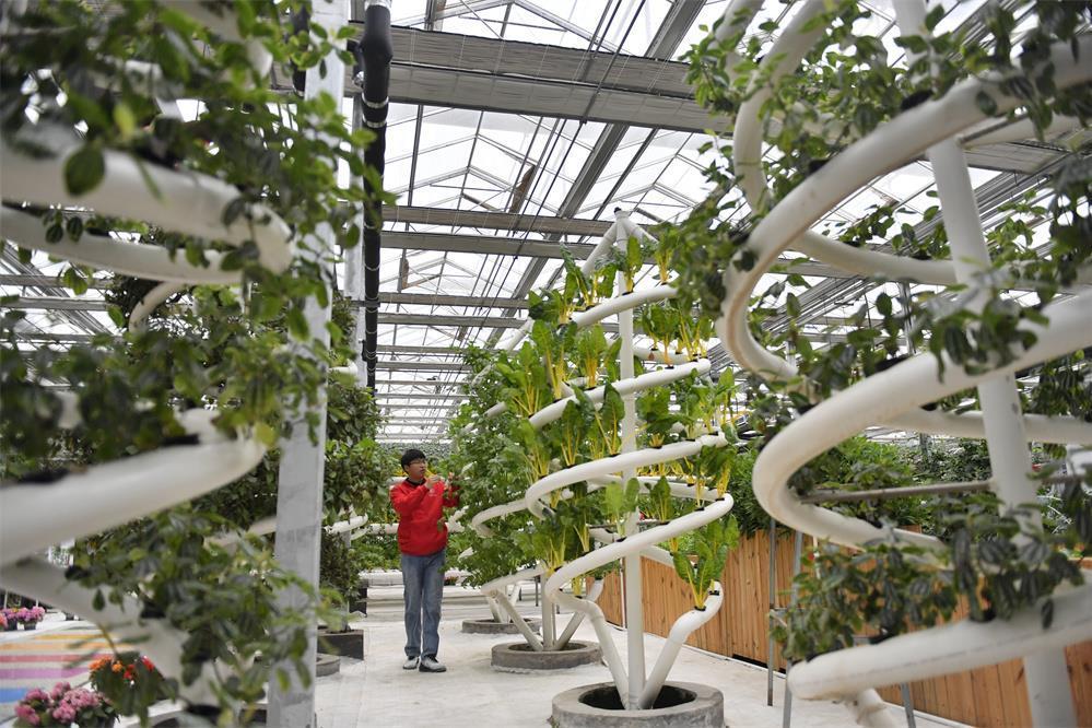 △2023年5月13日,在河北曲周縣育苗產(chǎn)業(yè)園,苗樂園科技小院的學(xué)生在查看無土栽培蔬菜。