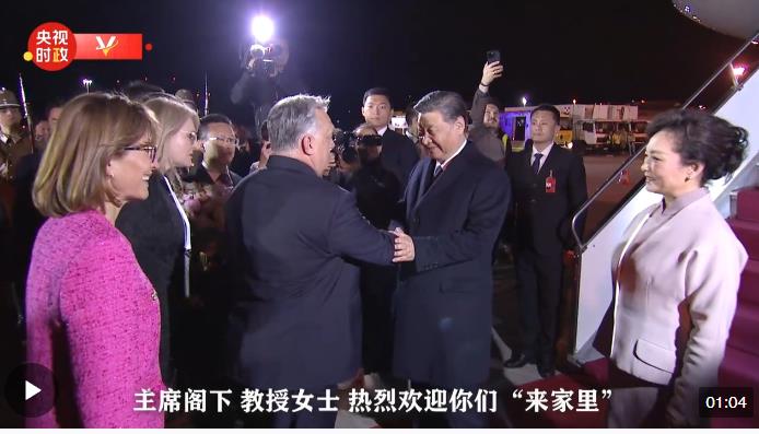 習(xí)近平乘坐的專(zhuān)機(jī)抵達(dá)布達(dá)佩斯國(guó)際機(jī)場(chǎng)時(shí),匈牙利總理歐爾班夫婦、外長(zhǎng)西雅爾多等政府高級(jí)官員熱情迎接。歐爾班總理對(duì)習(xí)近平主席夫婦說(shuō),歡迎你們“來(lái)家里”,我們感到極大榮光。