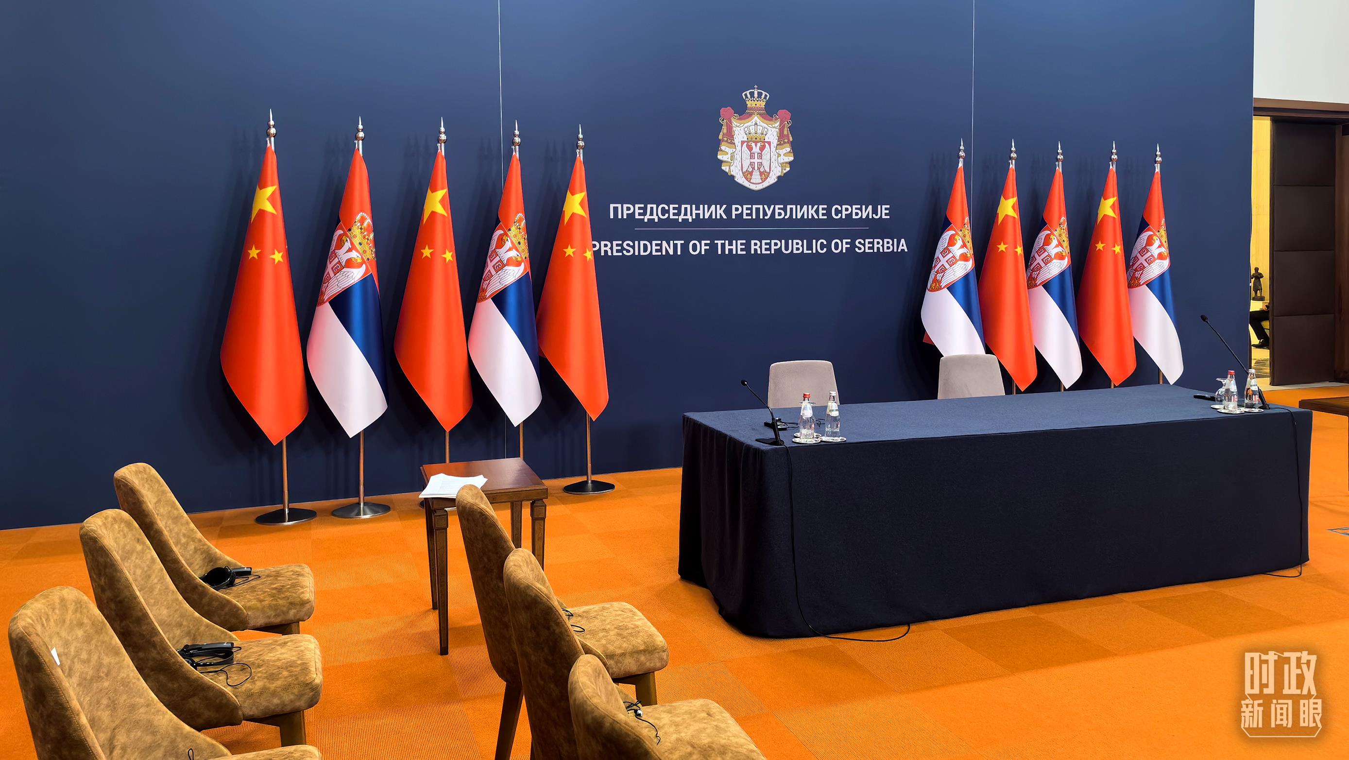 習(xí)主席同武契奇總統(tǒng)會(huì)談后共同會(huì)見記者,這是會(huì)見開始前的現(xiàn)場。(總臺(tái)央視記者鄂介甫拍攝)
