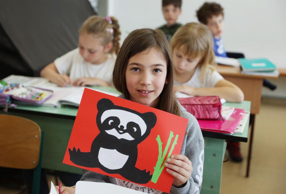 2024年5月3日,匈中雙語(yǔ)學(xué)校三年級(jí)學(xué)生寶怡展示自己的大熊貓形象美術(shù)作品。
