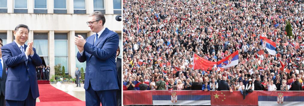 當(dāng)?shù)貢r(shí)間5月8日上午,國(guó)家主席習(xí)近平在貝爾格萊德塞爾維亞大廈同塞爾維亞總統(tǒng)武契奇舉行會(huì)談。會(huì)談前,武契奇總統(tǒng)陪同習(xí)近平主席來(lái)到政府大廈平臺(tái)(左圖)。大廈廣場(chǎng)上,塞爾維亞民眾揮舞中塞兩國(guó)國(guó)旗,對(duì)習(xí)近平主席表示最熱烈的歡迎(右圖)。