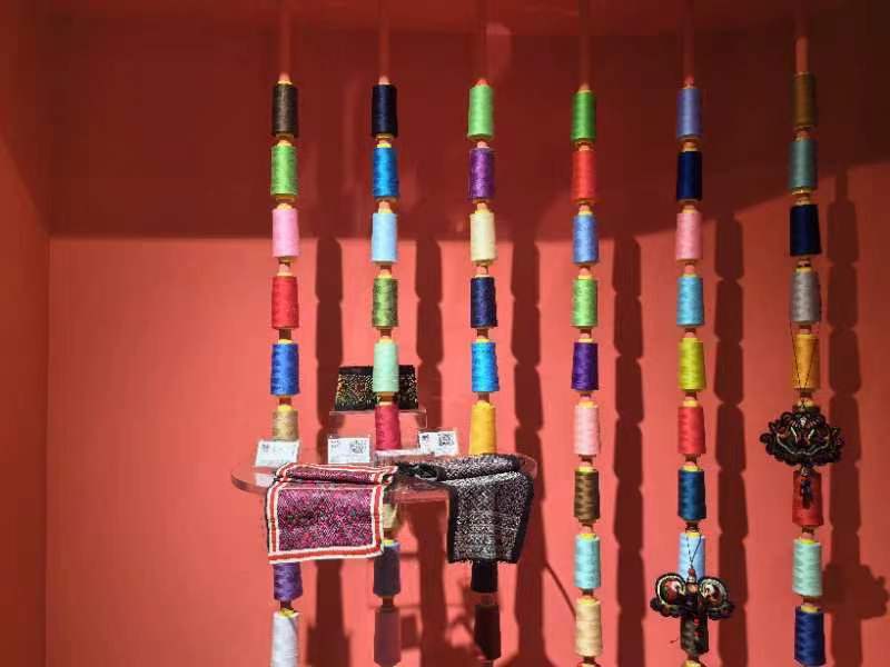 貴州省民族博物館內(nèi)展示的色彩斑斕的苗繡原材料及繡片(2024年4月27日攝)。新華社記者 楊欣 攝