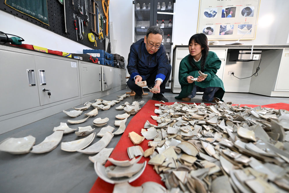 2024年2月23日,在中國(guó)社會(huì)科學(xué)院考古研究所安陽工作站,工作人員在整理修復(fù)殷墟洹北商城出土的陶片。