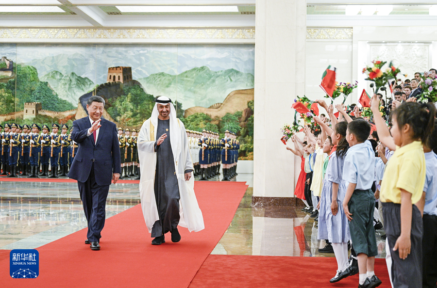 5月30日下午,國家主席習近平在北京人民大會堂同來華國事訪問并出席中國-阿拉伯國家合作論壇第十屆部長級會議開幕式的阿聯(lián)酋總統(tǒng)穆罕默德舉行會談。這是會談前,習近平在人民大會堂北大廳為穆罕默德舉行歡迎儀式。新華社記者 饒愛民 攝
