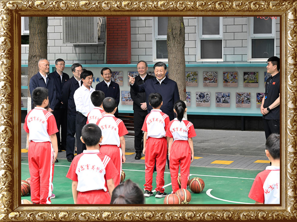 2023年5月31日上午,習(xí)近平總書記來(lái)到北京育英學(xué)??赐繂?wèn)師生,在籃球場(chǎng)同正在上體育課的小學(xué)生們親切交流。習(xí)近平親切地說(shuō):“現(xiàn)在生活條件好了,孩子們不是要吃得胖胖的,而是要長(zhǎng)得壯壯的、練得棒棒的?!?/strong>