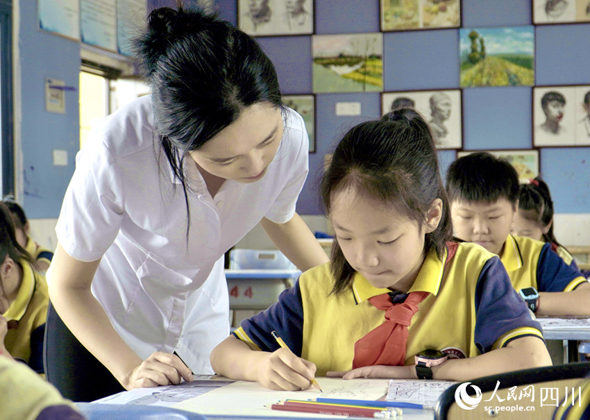 5月31日,南充市嘉陵區(qū)之江小學(xué),學(xué)生在老師指導(dǎo)下學(xué)習(xí)繪畫(huà)。人民網(wǎng) 趙祖樂(lè)攝