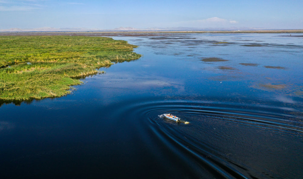 2023年9月15日,河湖濕地水環(huán)境保護(hù)與修復(fù)技術(shù)研究團(tuán)隊(duì)在內(nèi)蒙古烏梁素海采集湖水樣本(無人機(jī)照片)。位于黃河“幾字彎”頂部的烏梁素海,是黃河流域最大的湖泊濕地,是控制京津風(fēng)沙源的天然生態(tài)屏障。近年來,當(dāng)?shù)夭粩嗉訌?qiáng)烏梁素海綜合治理力度,生態(tài)環(huán)境持續(xù)好轉(zhuǎn)。