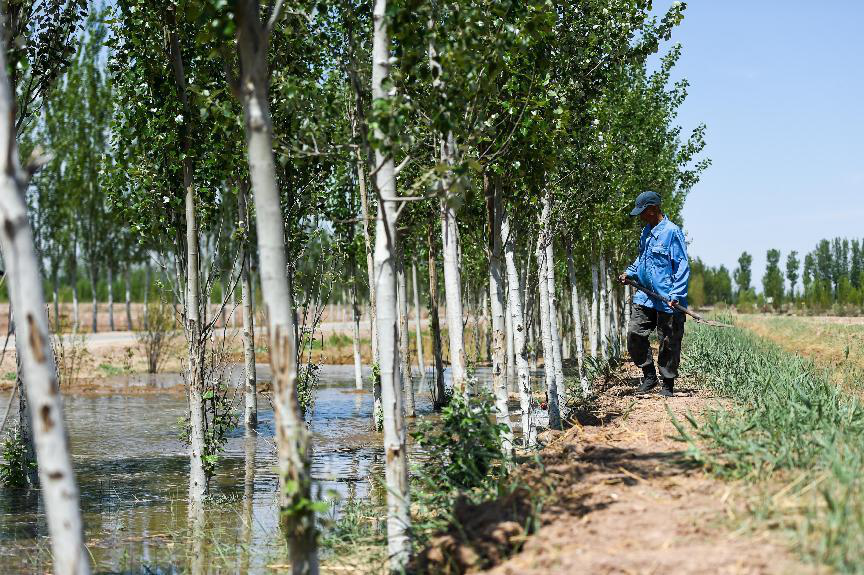 工人在內(nèi)蒙古巴彥淖爾臨河區(qū)國營新華林場(chǎng)管護(hù)樹木(2024年5月26日攝)。數(shù)十年來,林場(chǎng)結(jié)合“三北”防護(hù)林、京津風(fēng)沙源治理、低質(zhì)低效林改造等生態(tài)工程,持續(xù)提高森林覆蓋率。