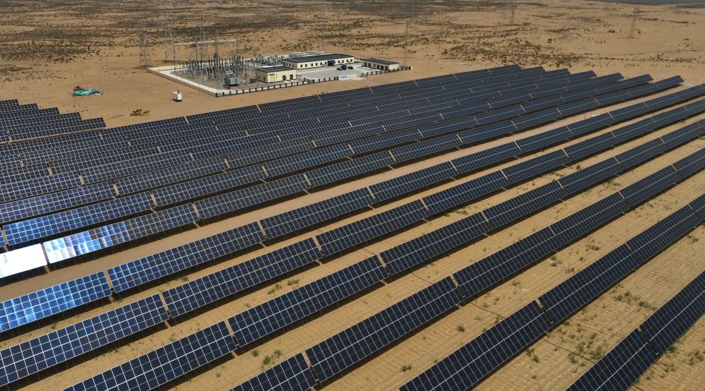 2024年5月16日在內(nèi)蒙古巴彥淖爾市磴口縣拍攝的烏蘭布和沙漠光伏基地(無人機(jī)照片)。烏蘭布和沙漠建設(shè)生態(tài)光伏基地,采取板上發(fā)電、板下種植的辦法,努力把沙海變?yōu)椤熬G海”。
