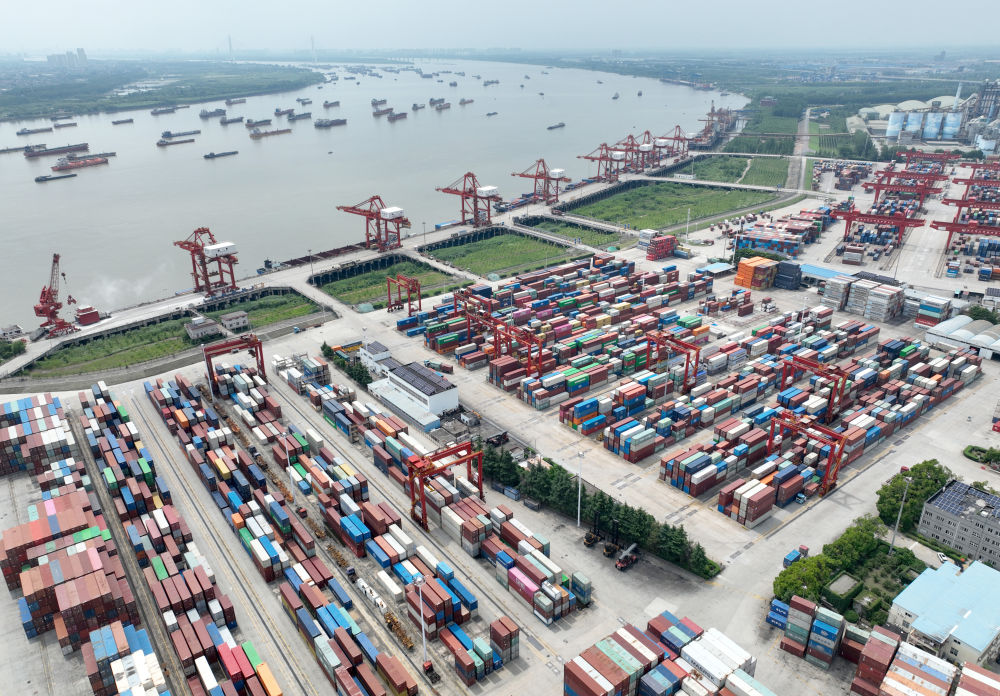 2024年6月1日拍攝的湖北武漢陽邏港(無人機(jī)照片)。2013年時,陽邏港僅有兩條集裝箱航線,船型小、班期少;如今,陽邏港已開通各類集裝箱航線20余條,實現(xiàn)“航運(yùn)向東入海、班列向西入歐”。