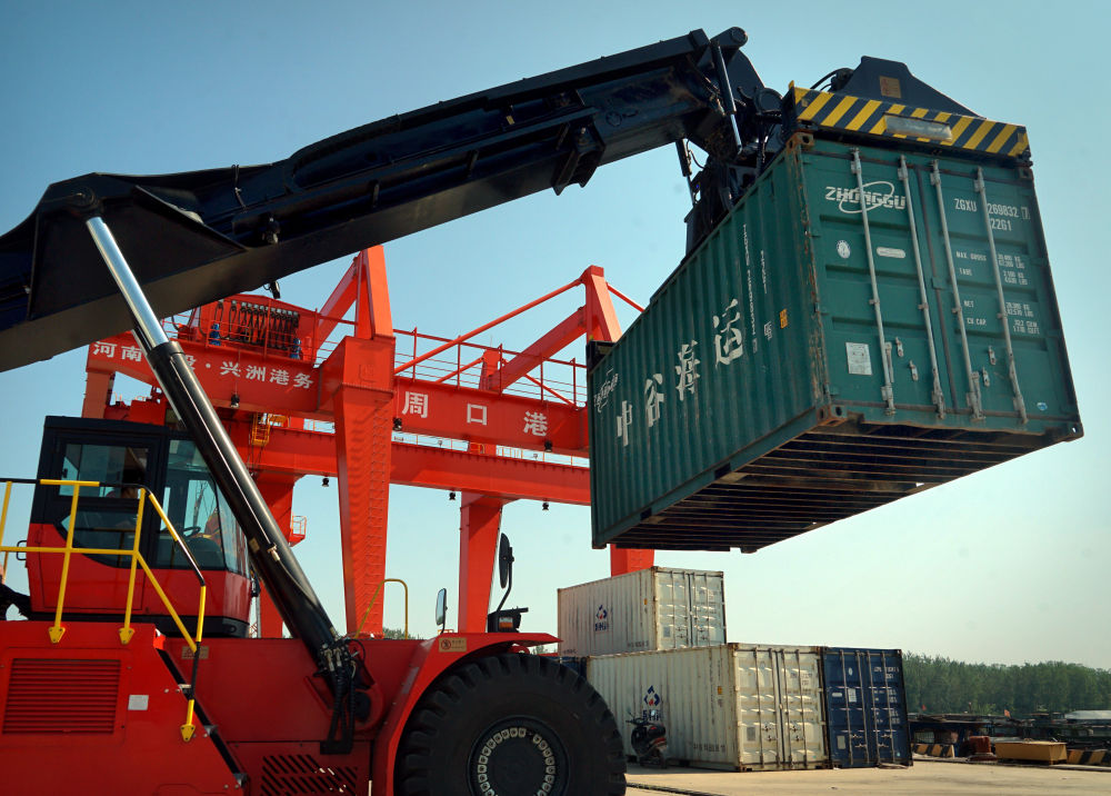 2020年8月27日,工人操作機(jī)械設(shè)備在河南周口中心港碼頭進(jìn)行吊裝作業(yè)。
