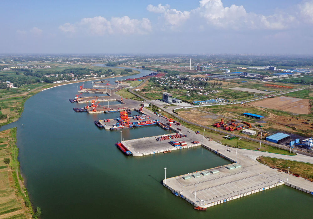 2022年6月28日拍攝的河南周口中心港碼頭(無人機(jī)照片)。近年來,河南積極推進(jìn)沙潁河航道升級改造,疏通內(nèi)河航運(yùn)。現(xiàn)在,從周口中心港出發(fā)的船舶可經(jīng)沙潁河至淮河、京杭大運(yùn)河駛?cè)腴L江,讓內(nèi)陸城市亦能通江達(dá)海。