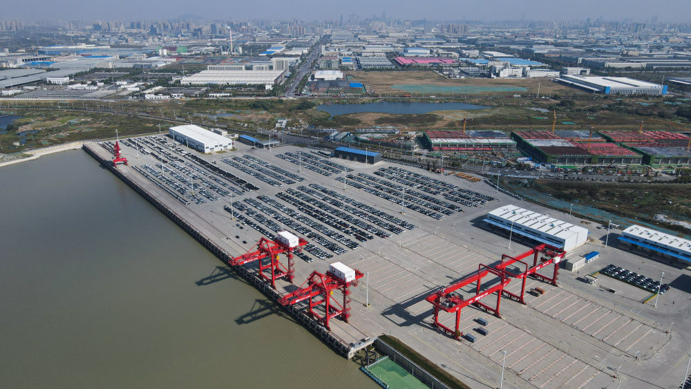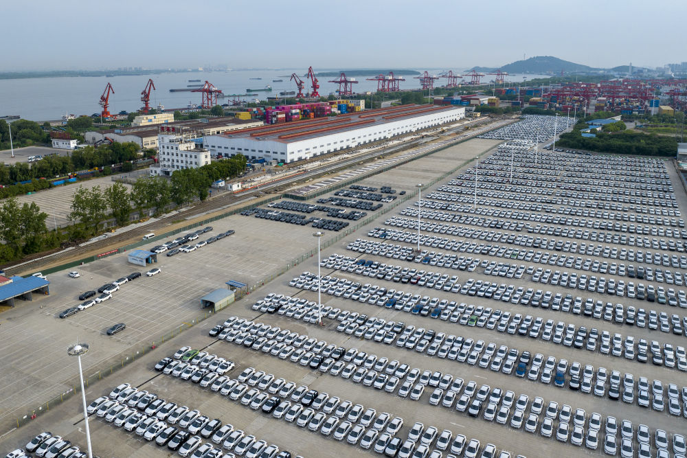 2024年5月26日,在安徽蕪湖港朱家橋港區(qū)國際集裝箱碼頭,整齊排列的汽車等待出口(無人機(jī)照片)。作為安徽省首個國家一類開放口岸,蕪湖港現(xiàn)已發(fā)展成為長三角城市群綜合交通運(yùn)輸體系的重要樞紐。