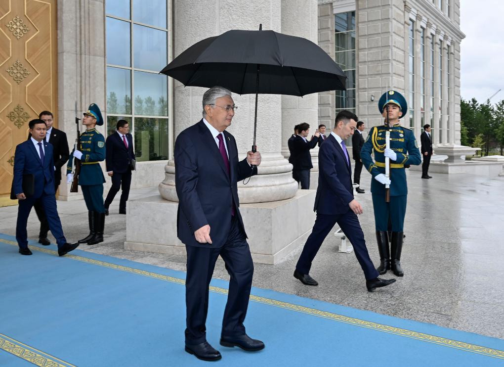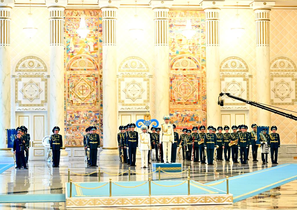 托卡耶夫為習近平舉行隆重歡迎儀式。總統(tǒng)府大廳氣勢恢宏,禮兵威武挺拔。兩國元首分別同對方陪同人員一一握手致意。兩國元首登上檢閱臺,軍樂團奏中哈兩國國歌。習近平在托卡耶夫陪同下檢閱儀仗隊。