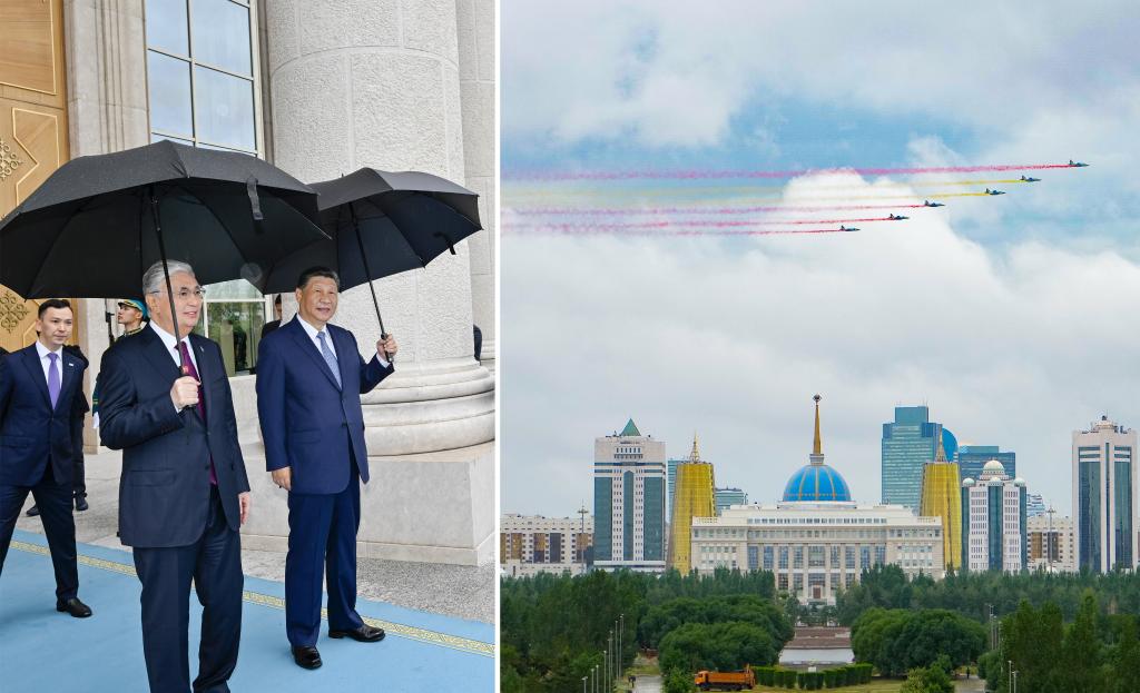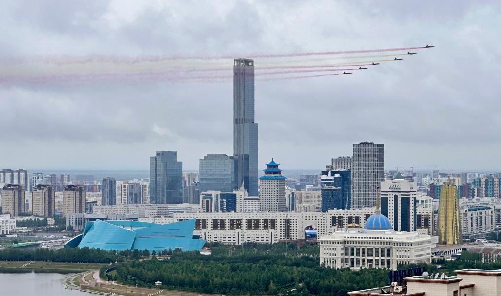 當?shù)貢r間7月3日,國家主席習近平在阿斯塔納出席哈薩克斯坦總統(tǒng)托卡耶夫舉行的歡迎儀式。習近平乘車抵達總統(tǒng)府時,托卡耶夫總統(tǒng)熱情迎接。六架哈薩克斯坦空軍戰(zhàn)機從總統(tǒng)府上空飛過,拉出象征中國國旗的紅黃色彩煙,以最高禮儀歡迎習近平對哈薩克斯坦進行國事訪問。