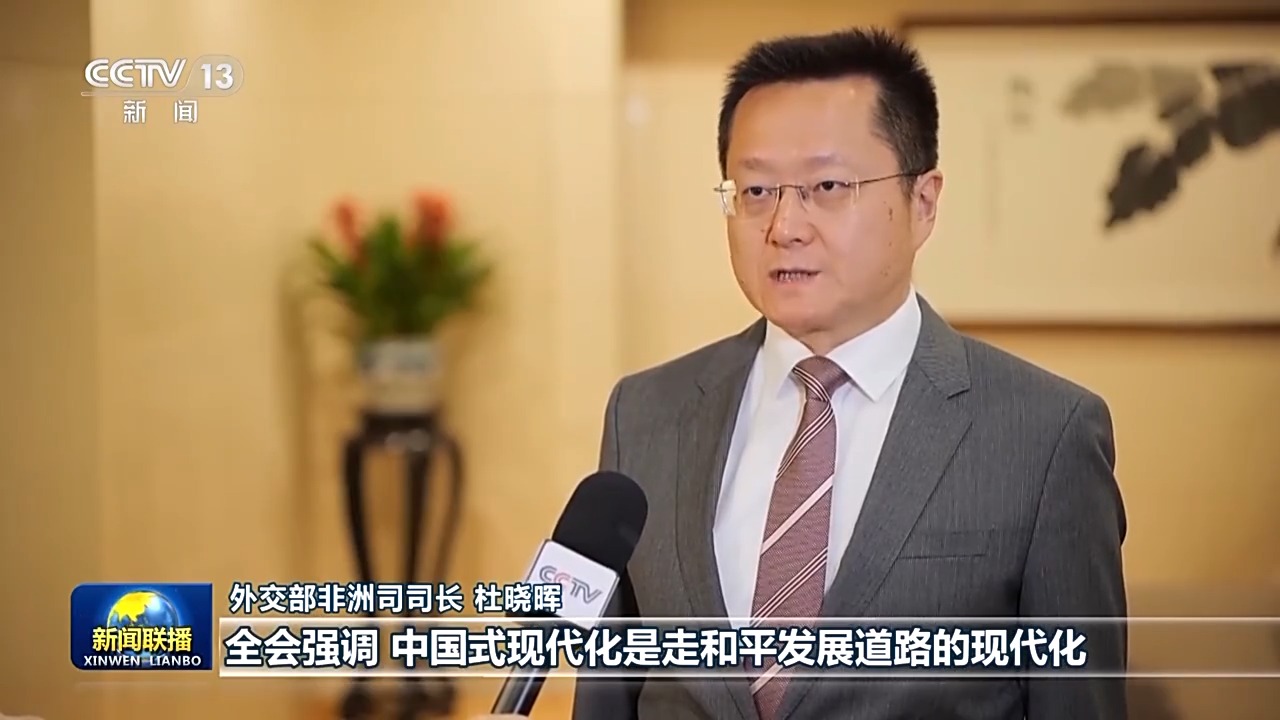 外交部非洲司司長 杜曉暉:全會強調(diào),中國式現(xiàn)代化是走和平發(fā)展道路的現(xiàn)代化,開放是中國式現(xiàn)代化的鮮明標(biāo)識。在百年變局加速演進、世界進入新的動蕩變革期的大背景下,三中全會給世界注入和平力量、穩(wěn)定力量、進步力量、發(fā)展力量。我們將以習(xí)近平外交思想為指引,堅定奉行獨立自主的和平外交政策,推動構(gòu)建人類命運共同體,為以中國式現(xiàn)代化全面推進強國建設(shè)、民族復(fù)興偉業(yè)營造更有利國際環(huán)境、提供更堅實戰(zhàn)略支撐。