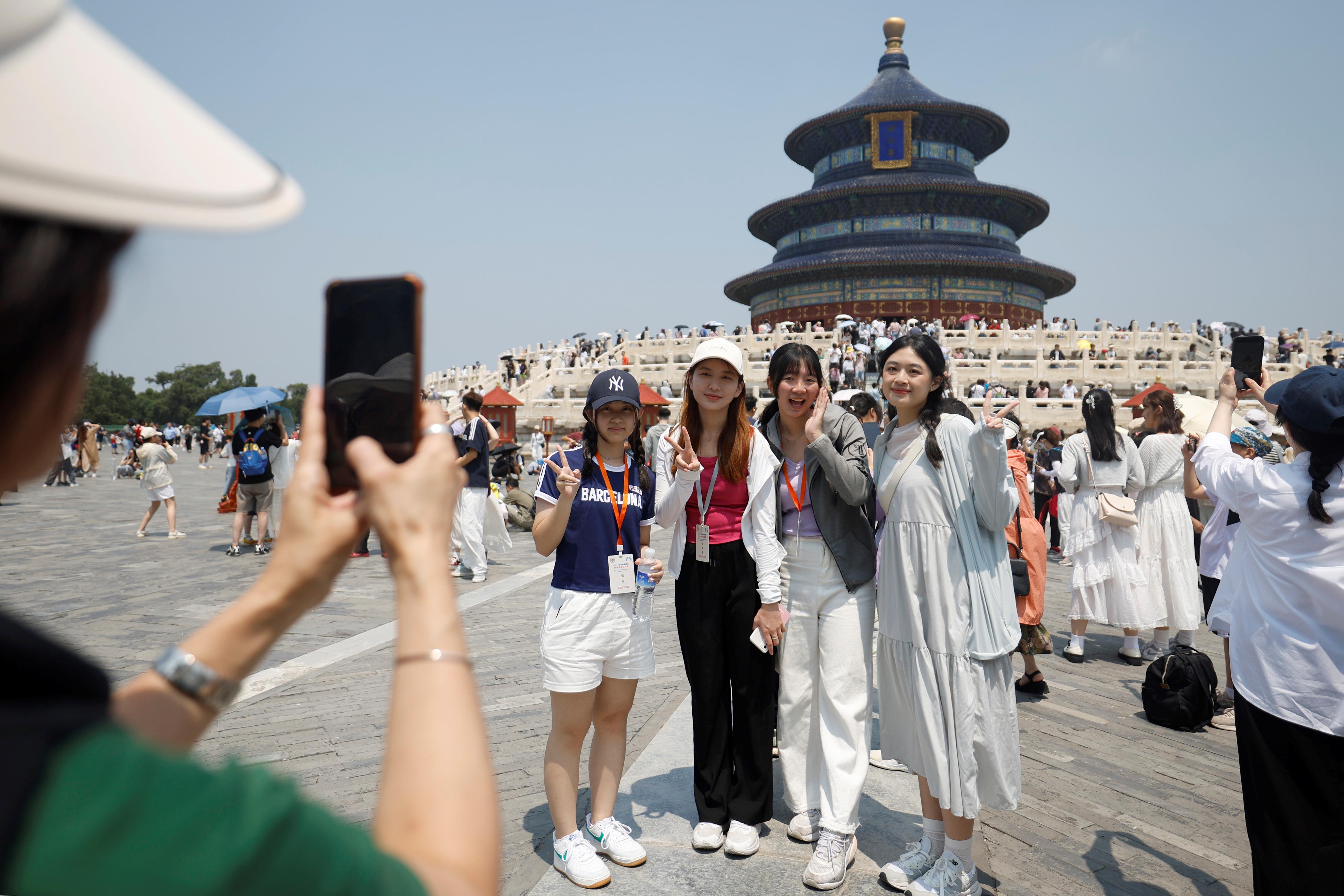 2024年7月3日,臺灣青年在天壇公園拍照留念。當日,2024“未來能源領袖”兩岸青年交流營的營員參觀游覽北京的奧林匹克公園、天壇公園等地。