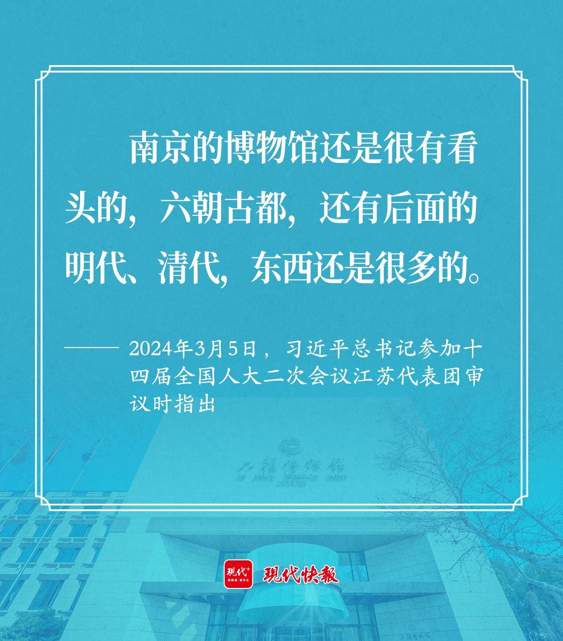 2024年3月5日,習近平總書記參加十四屆全國人大二次會議江蘇代表團審議??倳浽诼犕昴暇┦胁┪锟傪^副館長宋燕代表講述后表示,“南京的博物館還是很有看頭的,六朝古都,還有后面的明代、清代,東西還是很多的?!?/p>